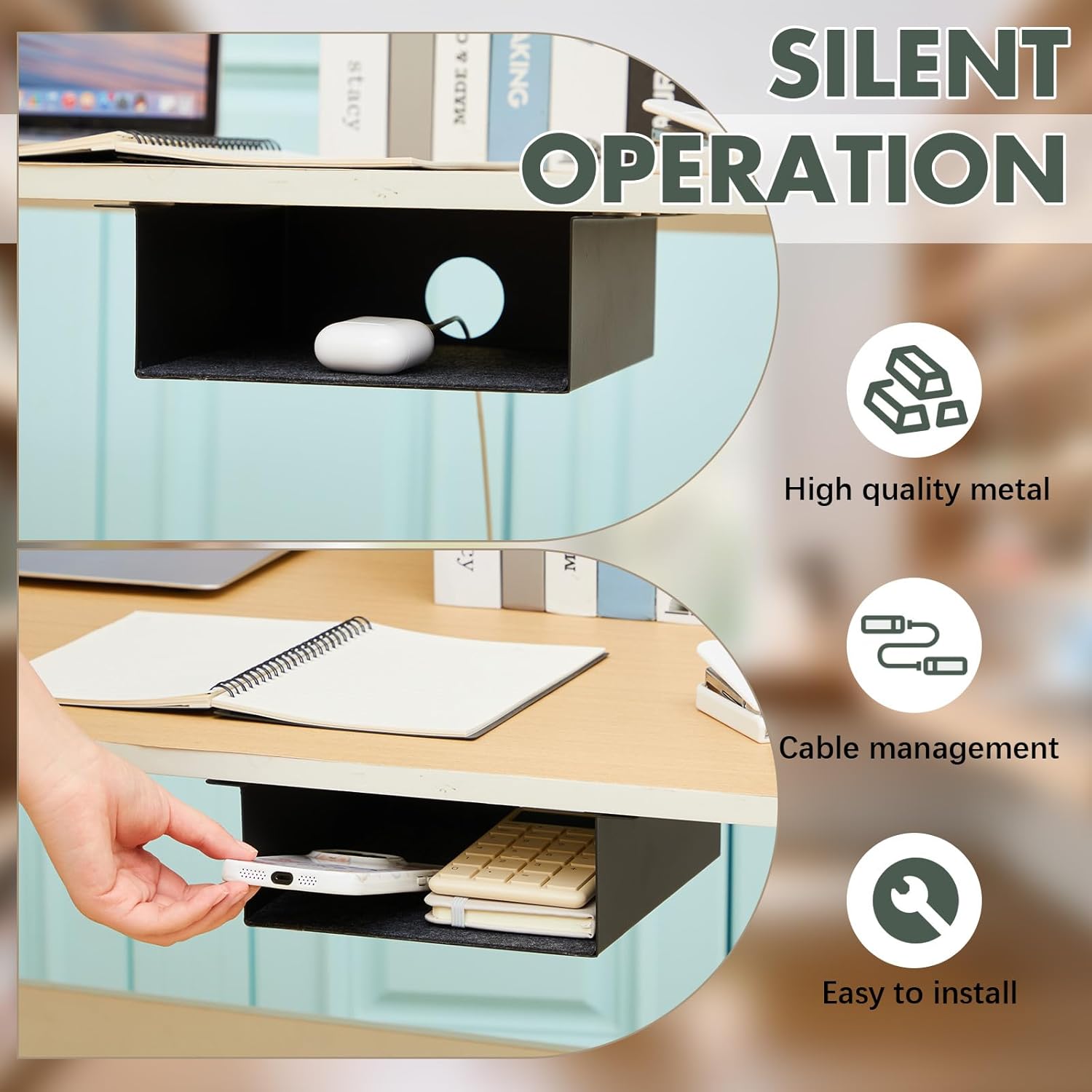 - Easy and Secure Installation: installation is a breeze with the provided strong double-sided tapes; If you prefer, you can also use screws for a more permanent installation; Forget complex or bulky hardware like those of traditional under-desk drawers