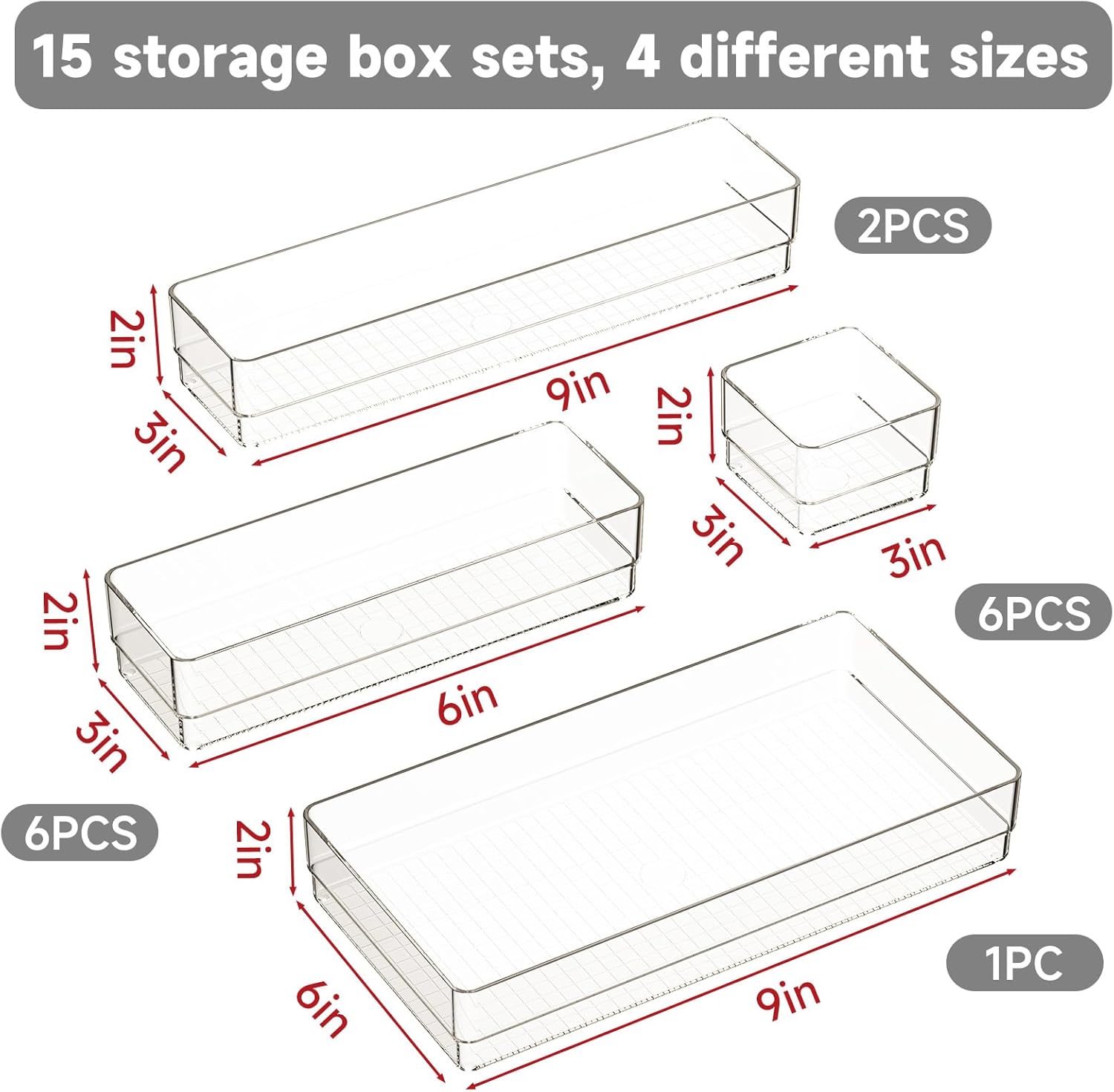 15 PCS Clear Plastic Drawer Organizer Set, 4 Sizes Acrylic Drawer Storage Trays Non Slip Storage Bins for Makeup, Jewelry, Gadgets for Kitchen, Bedroom, Bathroom, Office