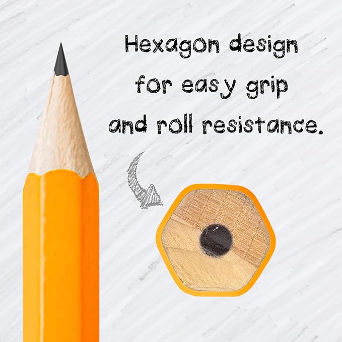 - HEXAGONAL ERGONOMIC DESIGN; Hexagonal grip of pencils #2 ensures comfortable, slip-free control for students and professionals, The anti-roll shape stays put on desks, perfect for exams, drafting, or long writing sessions with reduced hand fatigue