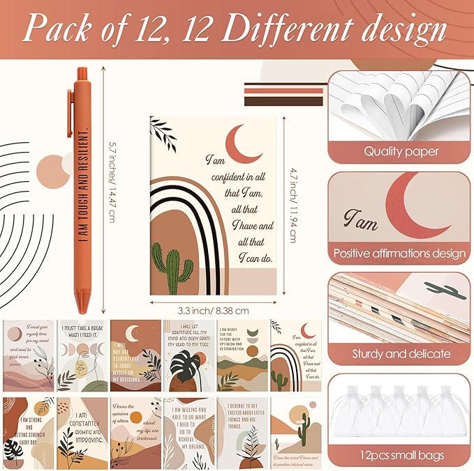 - Package Include: you will receive 12 pcs self care notebooks with 12 inspirational pens and 12 pcs small white bags, with this set, you can spread the joy of gratitude and positivity to multiple recipients, making it an ideal choice for bulk gifting