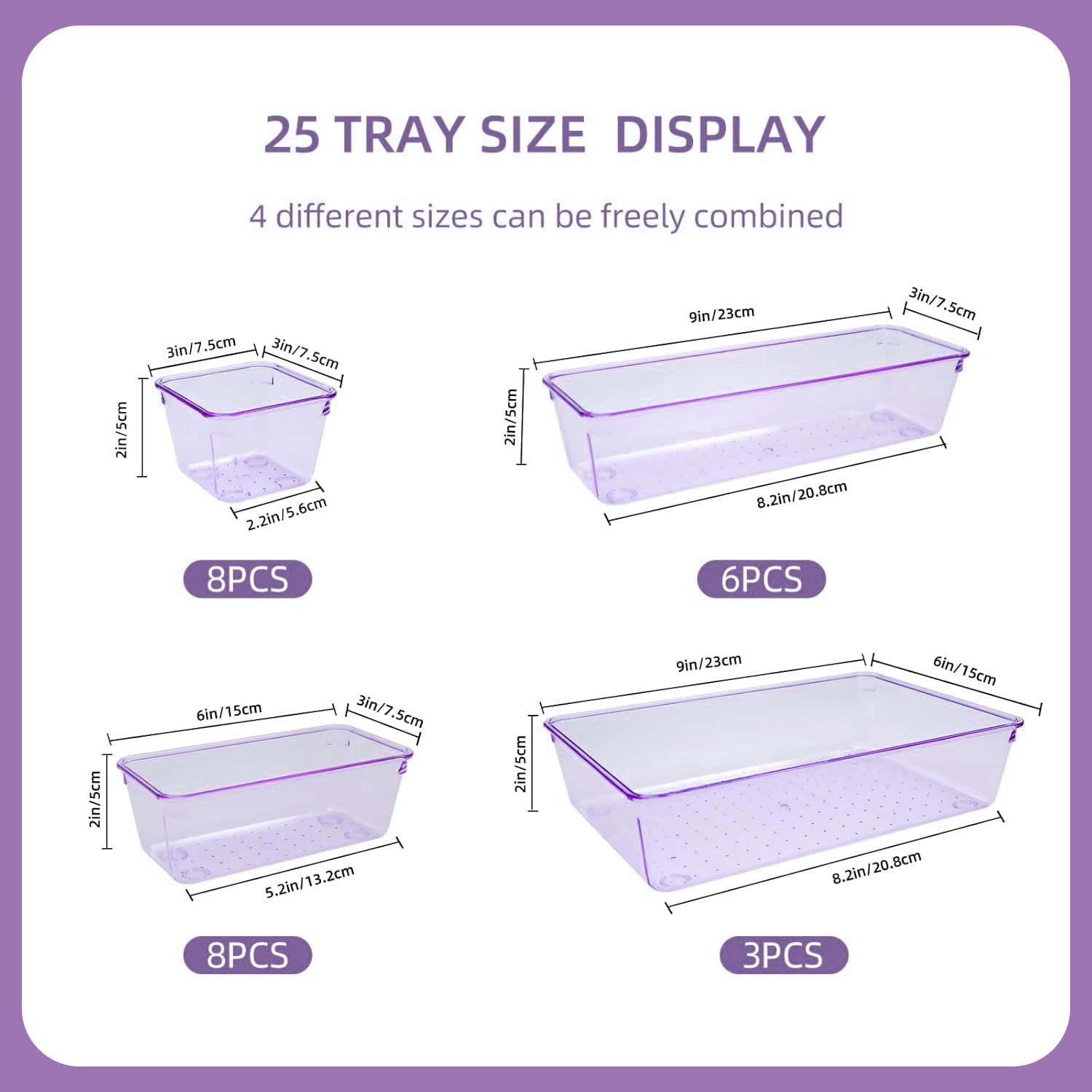 - 【4 SIZE Clear Purple MAKEUP DRAWER ORGANIZER TRAYS】 Total 25 PCS: 9 x 6 x 2 inches (3 pcs), 9 x 3x 2 inches (6 pcs), 6 x 3 x 2 inches (8 pcs), 3 x 3 x 2 inches (8 pcs), help you customize the combination to store items and organize drawers on shelves.