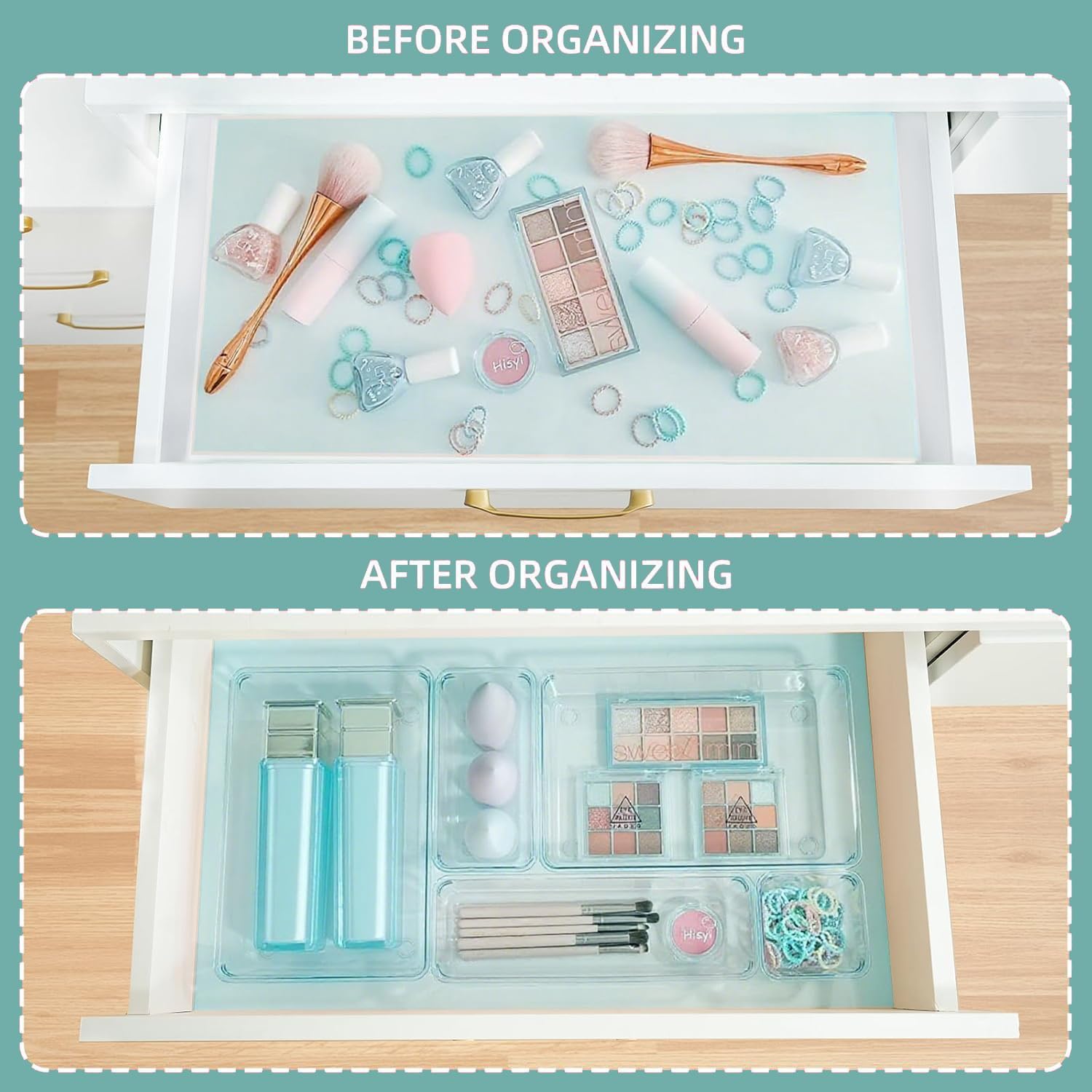 Kitchen Desk Drawer Organizers Storage for Office, Small Acrylic Vanity Trays Makeup Organizer for Drawer Bathroom Plastic Make up Organizers 25 Pcs Clear Blue