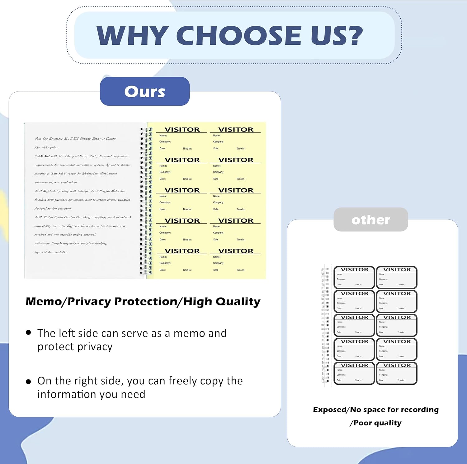 - Privacy Protected Carbon Copy Log Book System:This guest sign in book features a built in duplicate copy of every badge for accurate records privacy sheets between entries ensure each guest cannot view previous sign ins maintaining confidentiality and professionalism