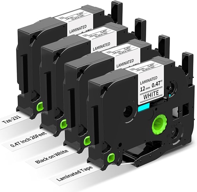 - 【Package includes】4 Pack Tze-231 Compatible for brother p-touch 12mm 0.47 laminated white tape (TZe231). Size: 1/2 Inch (12mm/0.47 inch) width, 26.2 Feet (8m) length each, 104.8 feet for 4-Pack. Color: Black on White TZe TZ AZe label maker tape